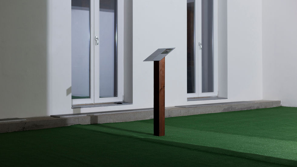 The Humblebrag exhibit is a distorted representation of a museum display of a college „safe space,“ including its fictional character, Humblebrag the dwarf. It removes the real object of the resting bench from the space of the Faculty of Fine Arts campus - which is literally only two hundred metres away from the gallery itself. The environment, mimicking its „original setting“ of green grass with garbage, resembles an open-air museum. The statuette of the deformed dwarf repeats overheard fragments of the students‘ speeches, shaped by its own logic into stories, questions about its limited world, and its own ontology, which is reflected in its physiognomy.