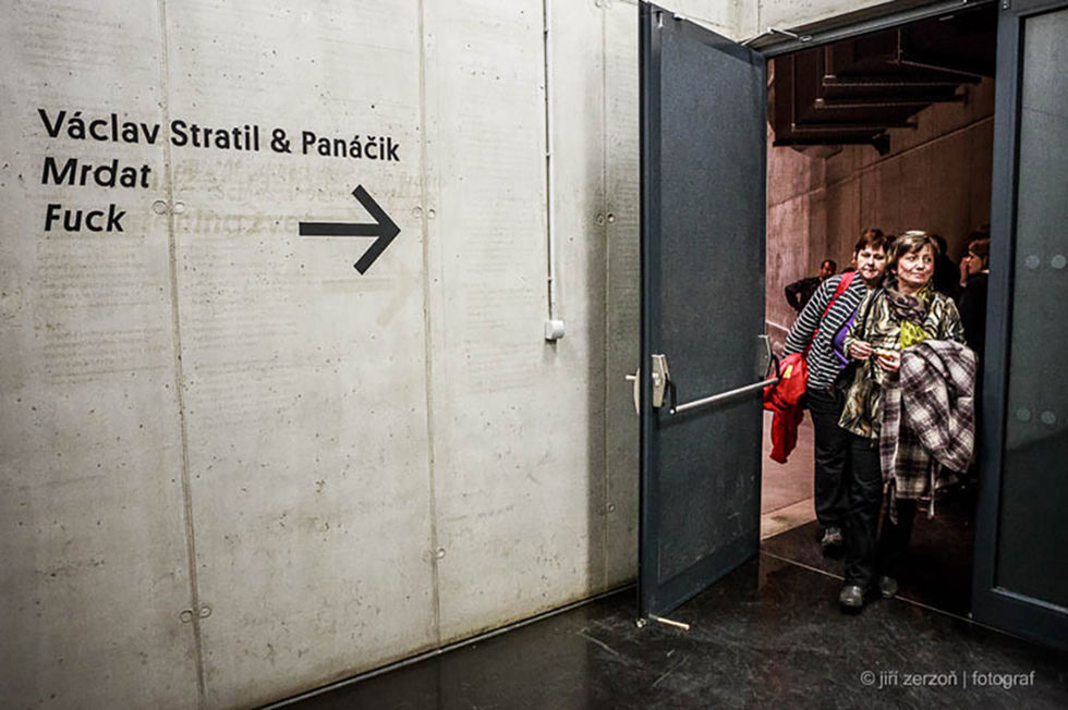 In 2013 the painter and performer Václav Stratil met up with a young Slovak musician, Panácik (Tomáš Moravanský), several times in a recording studio. As well as a guest appearance on Panácik’s album Mrakodrap (Skyscraper) and the recording of Stratil’s songs, another thing to come out of their meetings was the joint nine-minute composition Mrdat (Fuck).