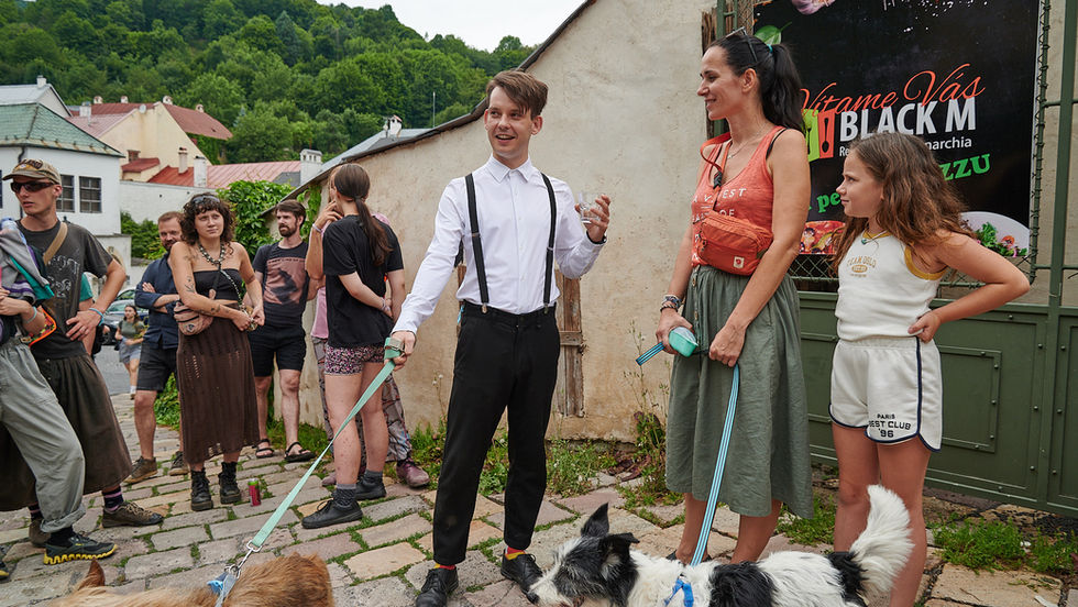 "Disgruntled Guide to Public Space" is a conceptual stand-up performance that explores a wide spectrum of genres and emotions within comedy, the complexity of public space, and the dissemination of information through media and physical environments. The work is part of an artistic research project examining humor and clowning through the lenses of Darwinism and memetics. The author, as a clown without a costume, loosely translates the thoughts of two mixed-breed dogs, Bilbo and Biela, from which fictional stories emerge that connect contemporary art concepts, conspiracy theories, and diary entries. The performance hyperbolizes the absurdity of media reality and the persona of the performer as a post-conceptual artist on the artistic scene.